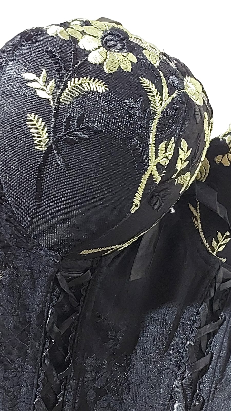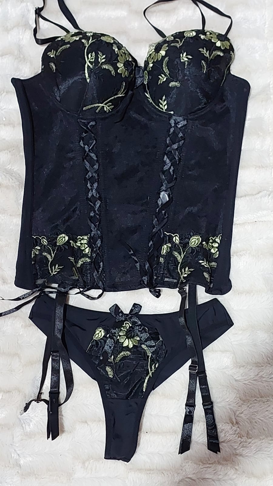 Este conjunto de lingerie possui um espartilho e uma calcinha em preto, ambos decorados com delicados bordados verdes, que criam um padrão floral. O espartilho tem alças ajustáveis, copas moldadas com bordado e um fechamento frontal com laços que proporciona um visual clássico e estruturado. A calcinha, em estilo tanga, apresenta um bordado semelhante e é adornada com um laço decorativo na frente. As ligas são ajustáveis, permitindo o uso de meias para completar o visual elegante e coordenado.